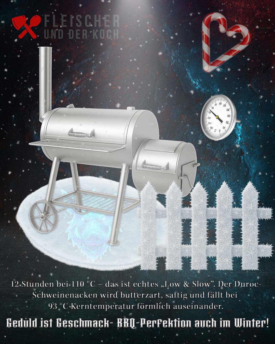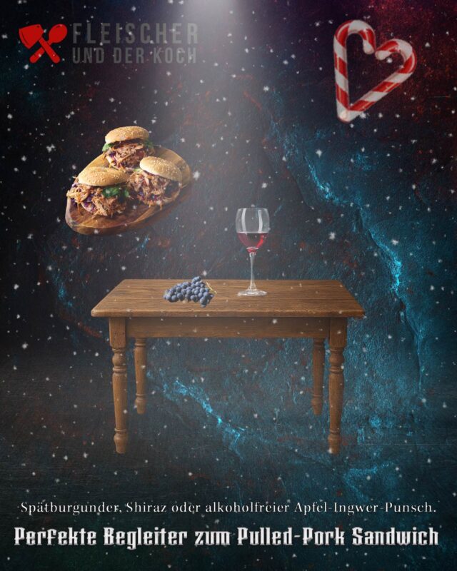 Der Duroc-Schweinenacken gart sanft bei niedriger Temperatur und entwickelt durch winterliche Gewürze wie Zimt, Muskat und Rauchsalz ein tiefes, festliches Aroma. Ob im Smoker, Kugelgrill oder Backofen – das Ergebnis ist immer zart, saftig und beeindruckend. Serviert mit hausgemachtem Coleslaw, Süßkartoffel-Buns und Glühwein-BBQ-Sauce wird daraus ein Menü, das Familie und Freunde begeistert.