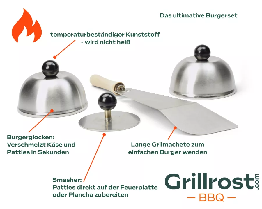 Mit diesem robusten, langlebigen und ergonomisch gestalteten Werkzeug meisterst Du das präzise Wenden und Verfeinern Deiner Grillgerichte – ein Muss für jeden ambitionierten Grillfreund.Burger Set – Smasher, Glocken Machete für perfekte Burger von der Feuerplatte: