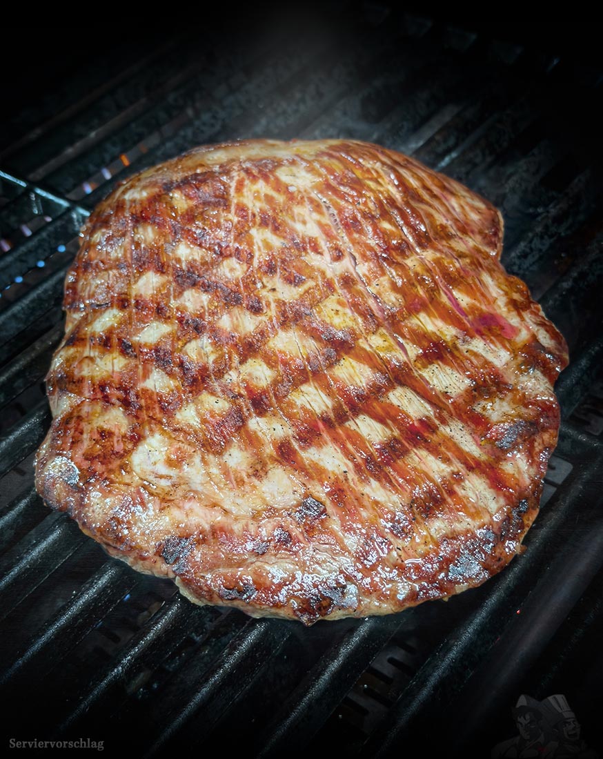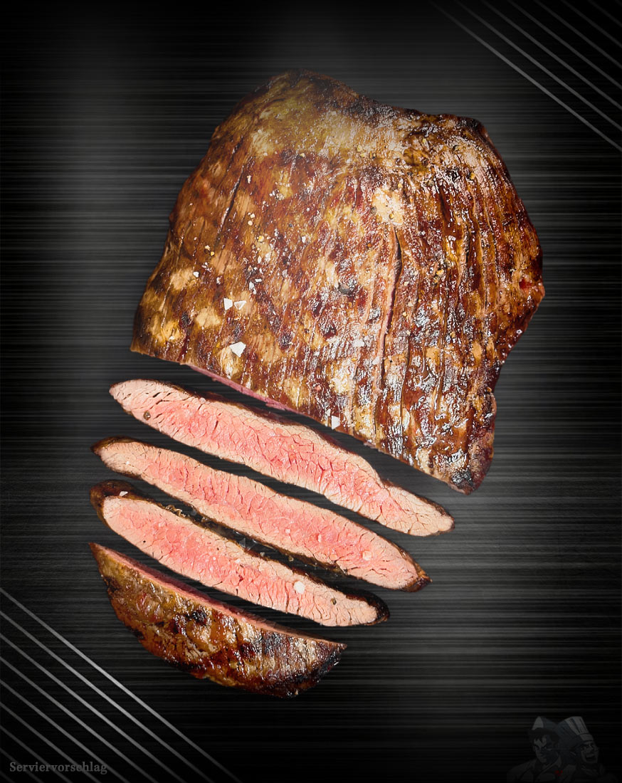 Schnelles und heißes Garen Das Flanksteak sollte schnell bei hoher Hitze gegrillt oder gebraten werden. Es entwickelt eine schöne Kruste an der Außenseite, während das Innere zart und saftig bleibt. Achte darauf, es nicht zu überkochen, da es sonst zäh werden kann.