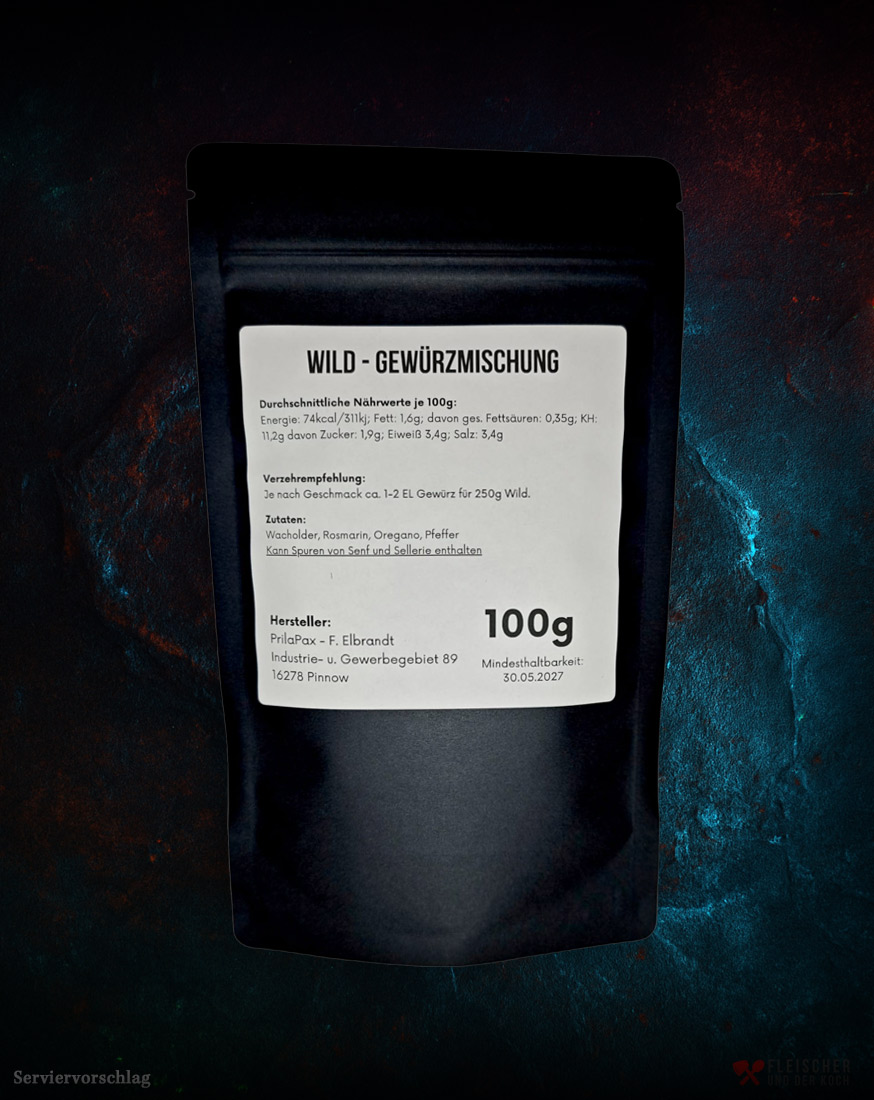 - Zubereitung: 1–2 EL Gewürz pro 250 g Wild, als Trockenrub oder Marinade