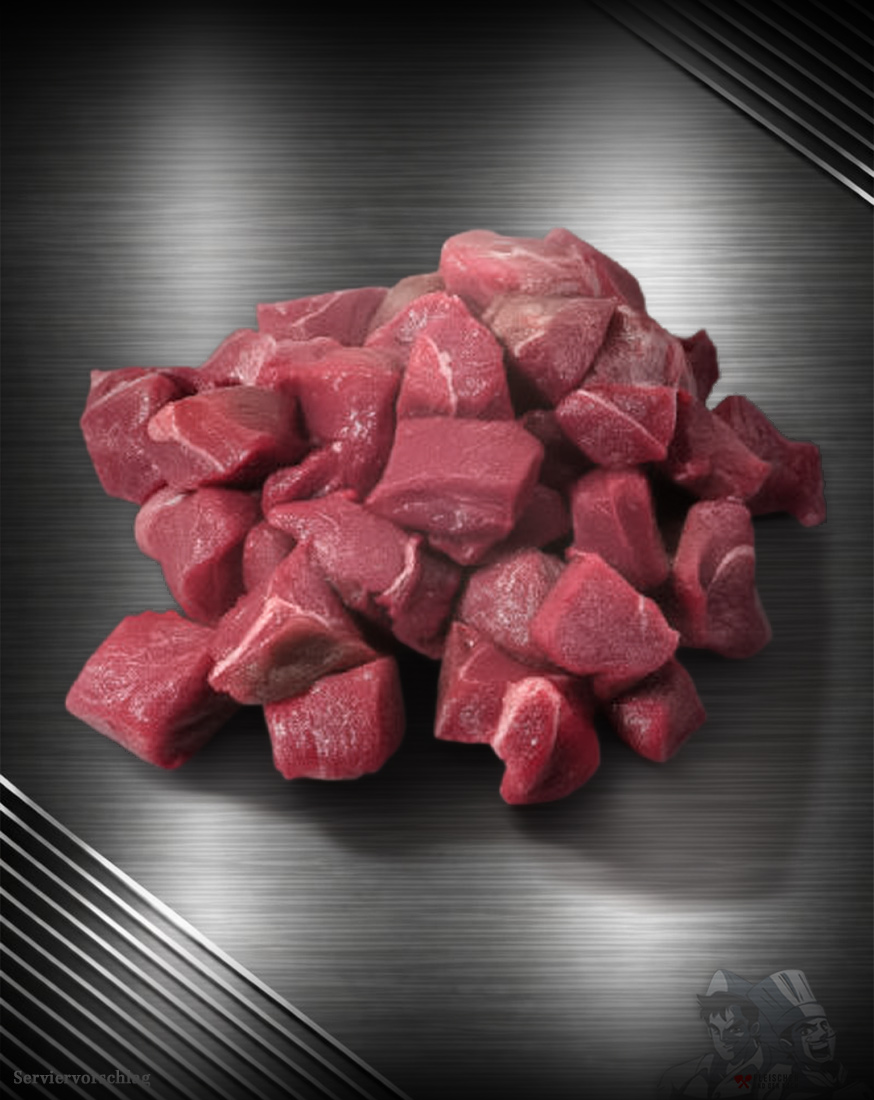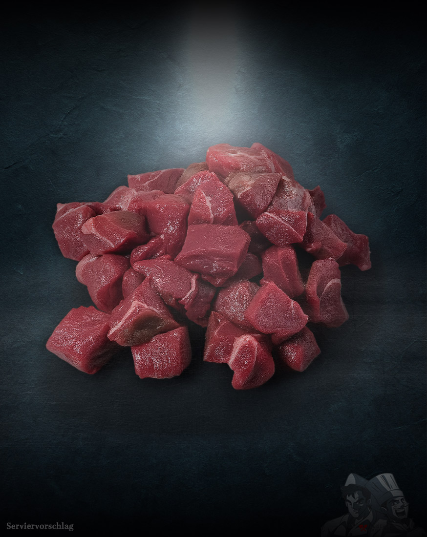 - Zuschnitt: küchenfertig gewürfelt, mager bis mittelfett